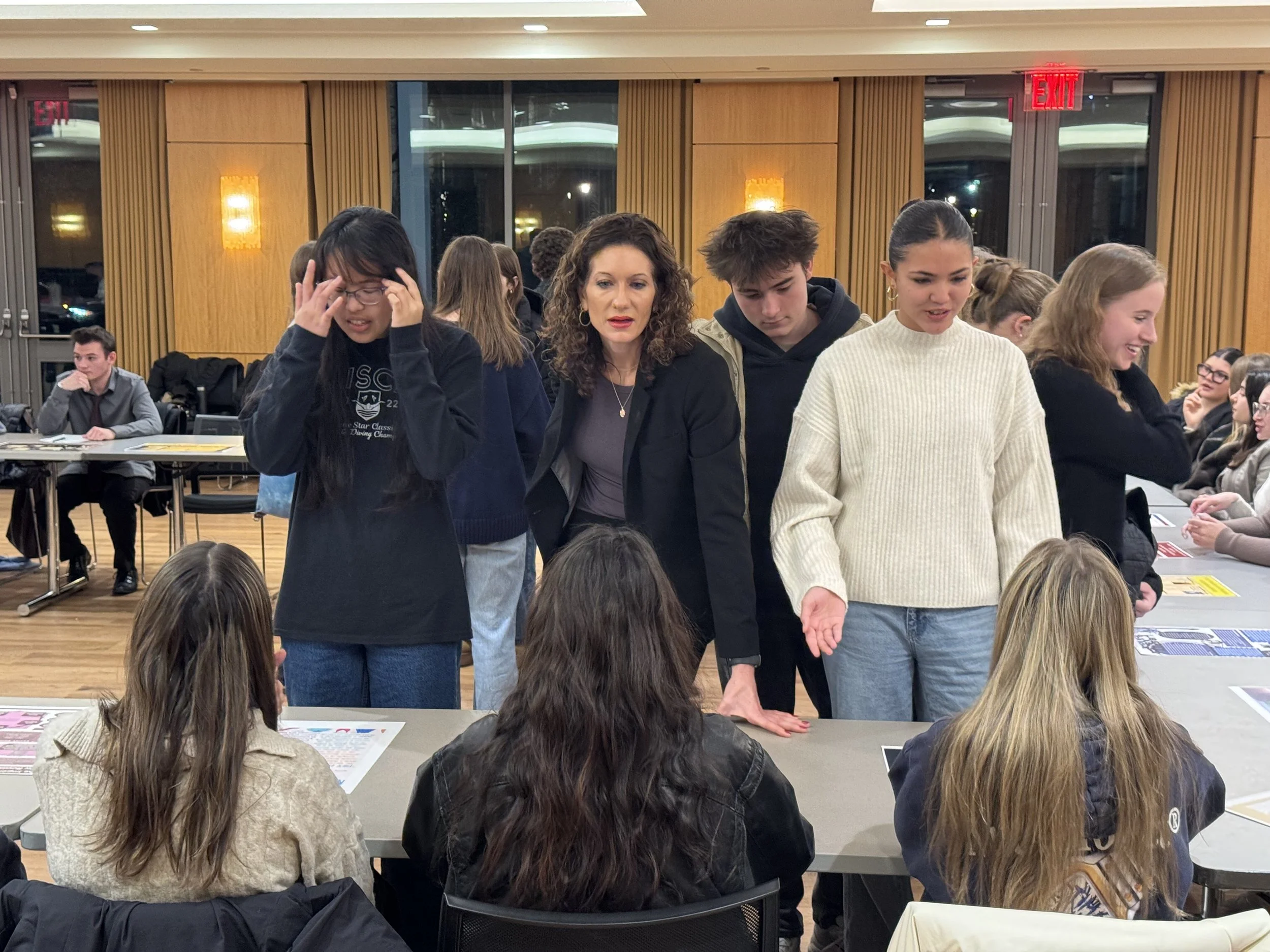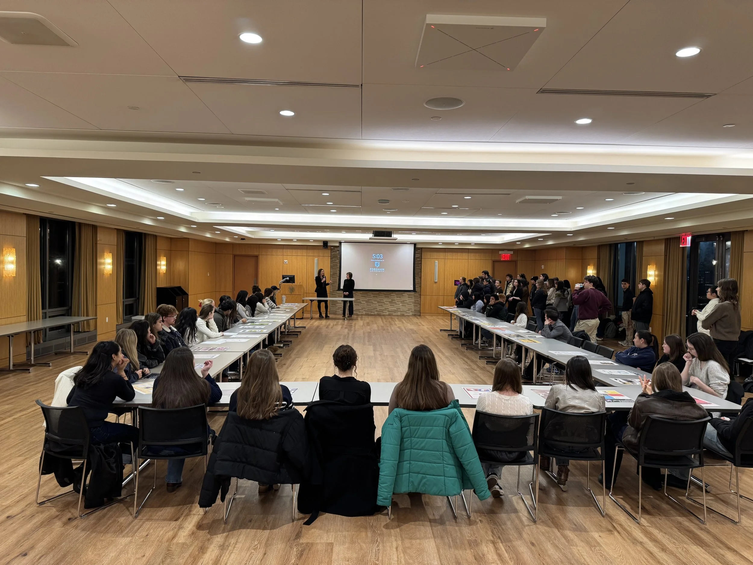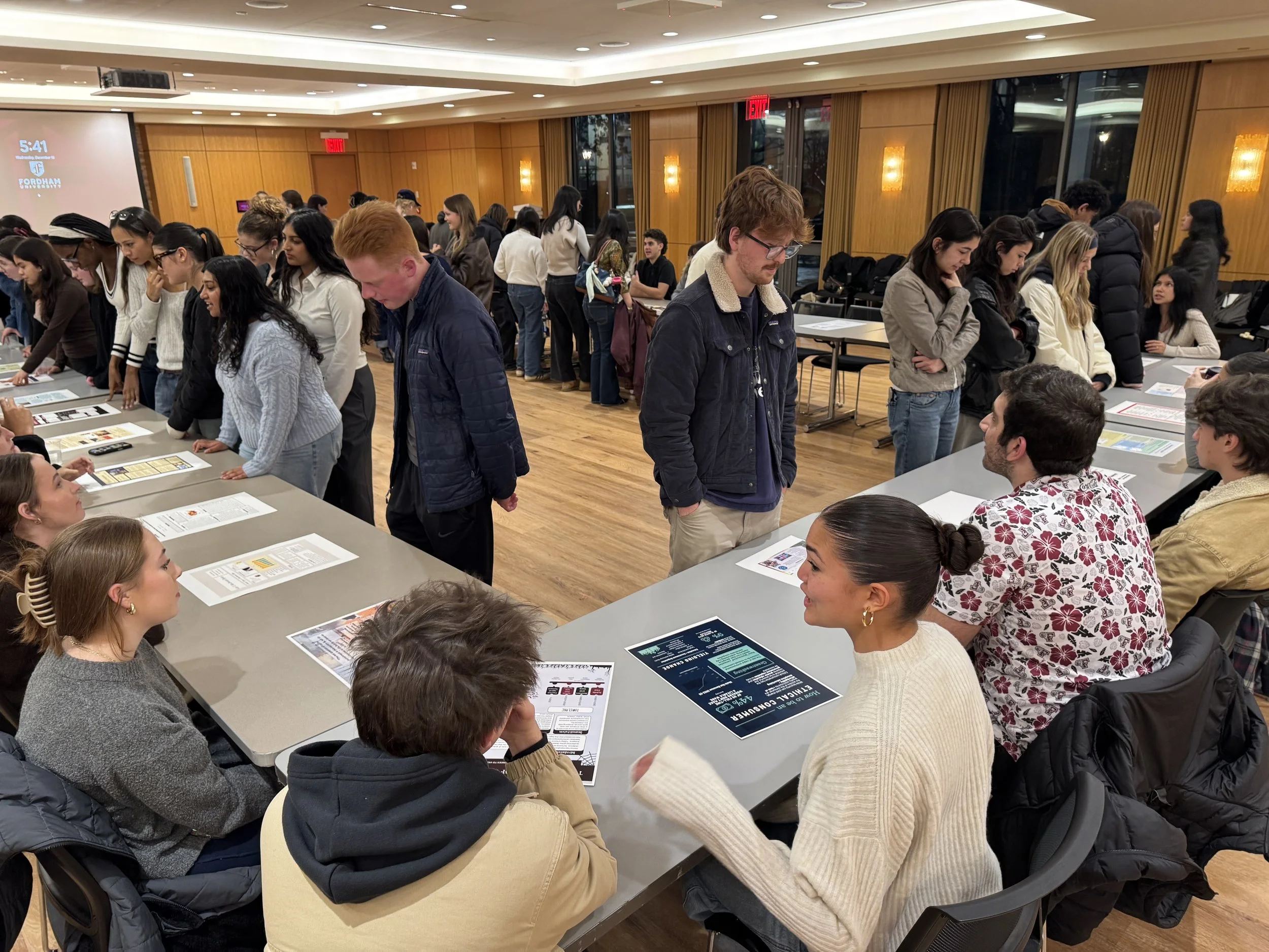 As the student presenters finished their preparations, Professor Beckenstein encouraged them to walk around, chat, and ask each other questions. For the remainder of the event, that is exactly what happened. While half of the students served as presenters, sitting in a U-shaped formation, the other half circulated the room and spoke with their peers about their projects. At the midway point, Professor Beckenstein called for a switch, and the second group of students was then able to present their work. Curiosity and enthusiasm buzzed about as students wandered from poster to poster, from presenter to presenter. Why did you choose this topic? How did it resonate with you? What was the most interesting thing you learned? These were some of the questions asked as discussions sparked to life, prompting intellectual exchanges between the students as they learned more about the variety of topics to which their peers had dedicated themselves.